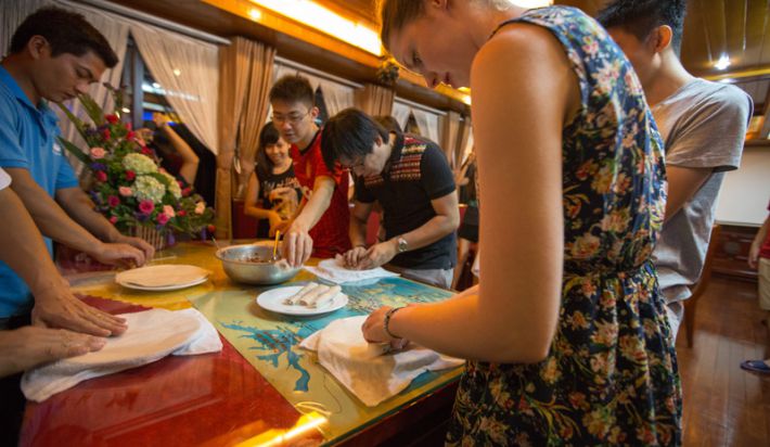 18:30: Join cooking class demonstration (Teaching you how to make our specialty, Spring rolls) on board.